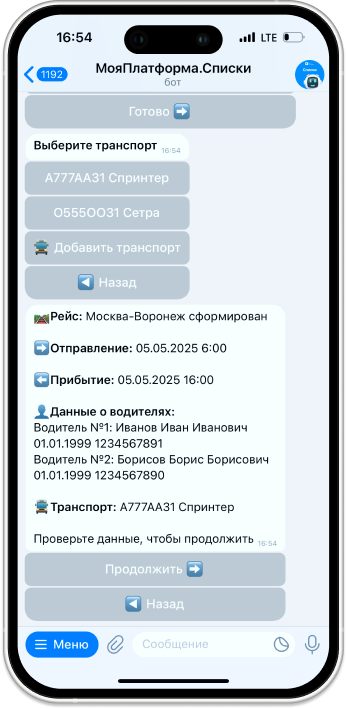 Формирование карточки рейса и добавление